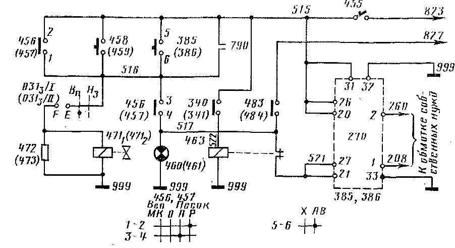 управление подсыпкой песка) электропневматические вентили песочниц возбуждаются сразу/ Когда переключатель 456 (457) находится в положении А (автоматическое управление подсыпкой песка с помощью блока 270), создается цепь: общий плюсовой провод 823 — АЗВ 455— исполнительный элемент устройства противобоксовочной защиты между выводами 20, 26 и 21, 27 блока 270— размыкающие контакты реле 463, предназначенного для исключения автоматической подсыпки песка при движении электровоза на позициях ослабленного поля тяговых двигателей, — контакты 3-4 переключателя 456 (457) — блок-контакты 031 зп (031 ъ/и) реверсоров — катушка электропневматического вентиля 471г (471г) [470 (471)}. Описанная цепь обеспечивает автоматическое включение песочниц в начале боксования колесных пар электровоза. Во время автоматической подсыпки песка загораются красные сигнальные лампы 460 (461), расположенные на пультах управления электровозом.