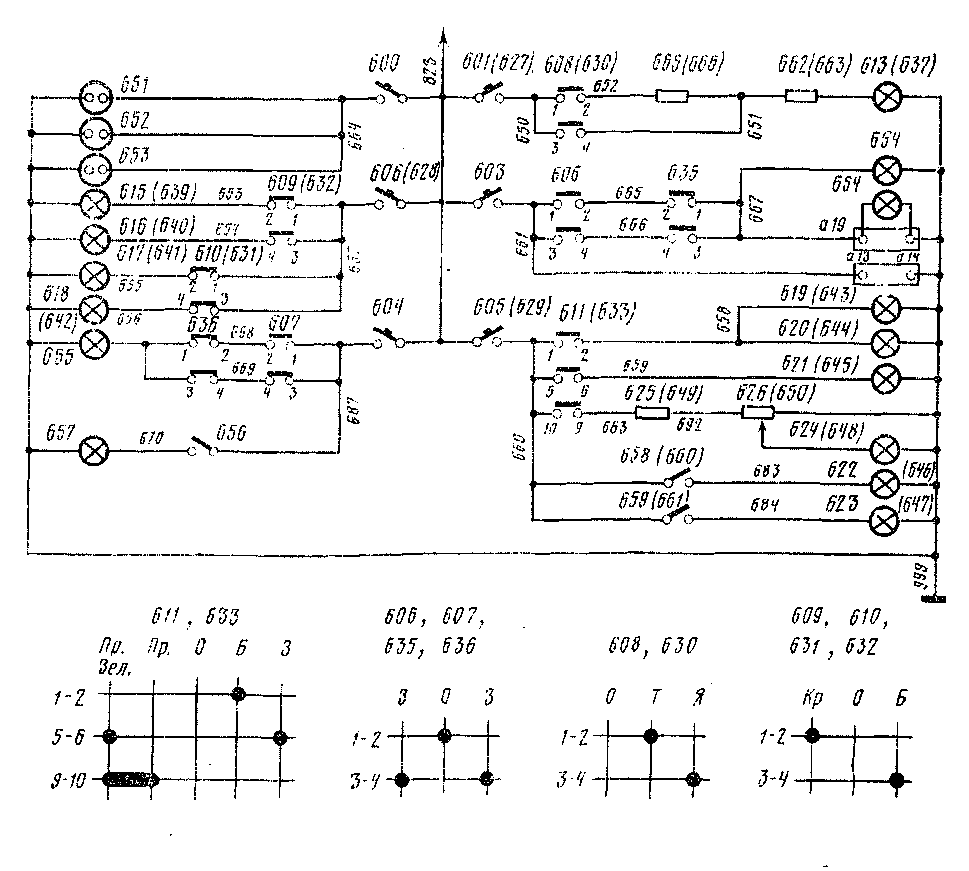 Буферные фонари белого и'красного света 615—618 н~639—642 можно включить и выключить переключателями 609, 610 и 631, 632.