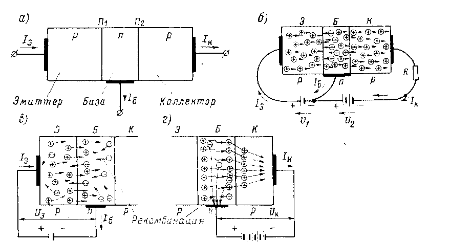 Рис. 120. Структурная схема (а) и физические процессы (б. в. г) в транзисторе