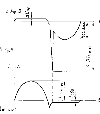 заперт, т. е. когда к вентилю приложено обратное напряжение, под действием которого протекает небольшой по величине обратный ток. В момент времени, когда вентиль переходит из открытого состояния в запертое, вентиль пропускает обратный ток, величина которого значительно превосходит величину обратного тока установившегося режима (1„6р на рис. 127). Этот пик обратного тока спадает так быстро, что вызывает пик перенапряжений, величина которого в 2—3 раза превышает величину максимального обратного напряжения. Такие пики перенапряжений возникают с повторяемостью 50 раз в секунду, т. е. каждый раз, когда вентиль переходит из проводящего состояния в запертое.