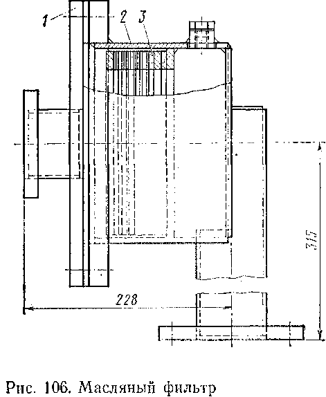 цев с трубами охладительной системы. Поверхность охлаждения маслоохладителя 60Е больше, чем у маслоохладителя электровоза ЧС4, и составляет 39 м2. Каждый из двух маслоохладителей обдувается воздухом, засасываемым отдельным вентилятором; нагретый воздух выбрасывается под кузов электровоза. При демонтаже маслоохладителя следует закрыть кран на трубопроводе 7 (см. рис. 102), выпустить масло и после открытия щита на камере 3 (см. рис. 104) произвести демонтаж прижимных колец / и отсоединить крепящие маслоохладитель болты. Монтаж системы производится в обратном порядке, причем перед окончанием заполнения камеры маслоохладителя маслом следует удалить из нее воздух, отвернув для этого пробку 4. При демонтаже масляного насоса и фильтра необходимо перекрыть затворы 9 (см. рис. 102) и выпустить, масло через отверстие 2.