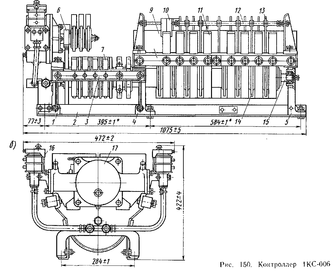 Контроллер установлен в закрытом ящике. Каркас его состоит из двух продольных стальных угольников 2 и трех поперечных алюминиевых рам 1, 4, 5, которые крепят на угольниках, и в них вращается вал 15 с кулачковыми шайбами 14. Вал вращается пневматическим приводом 17 системы Л. Н. Решетова через зубчатую передачу 6 с передаточным отношением 10:3. По обе стороны кулачкового вала на текстолитовых рейках 8 установлены 14 кулачковых контакторов // силовой цепи КР-6А-1 и два кулачковых контактора 10 силовой цепи КР-8А-1, а на стальных рейках 3 — восемь кулачковых контакторов 7 цепей управления КР-ЗА-1.
