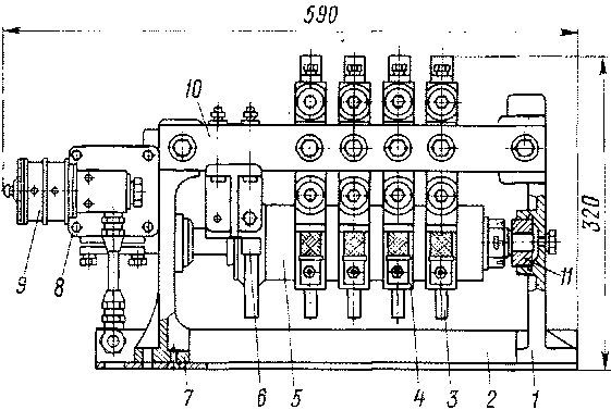 Работа контроллера осуществляется при помощи многопозиционного пневматического привода системы Л. Н. Решетова, который состоит из двух цилиндров 1 (рис. 151) с картером и поршнями 3 (диаметром 50 мм, ход 56 Мм), соединенными общим штоком 6.