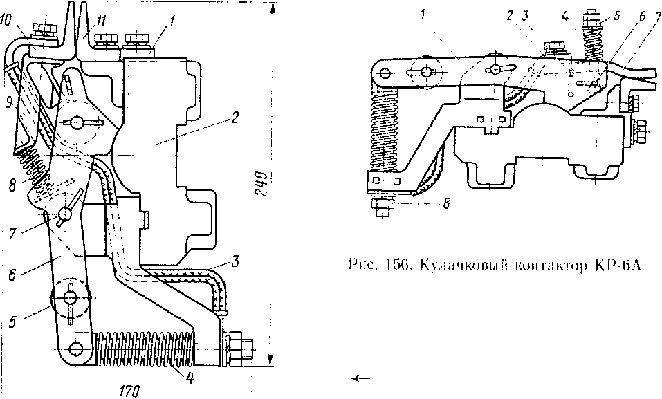 Кулачковый контактор КР-6А отличается от контактора КЭ-4Д только конструкцией подвижного контакта. Подвижной контакт — пальцевый без контакто-держателя, пружина вынесена за точку опоры подвижного контакта. Эти изменения позволили уменьшить момент инерции и тем самым уменьшить возможность отскоков подвижного контакта при включении. Контакт 7 (рис. 156) опирается