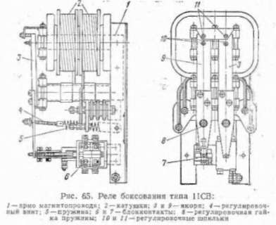 Реле бсксования типа 1ІСВ (рис. 65) служит для зашиты тяговых двигателей при боксозании отдельных колесных пар. На каждую пару двигателей устанавливается одно реле. Оно состоит из