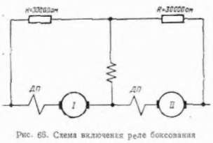 Катушки реле включаются по мостовой схеме между двумя тяговыми двигателями, как показано на рис. 66. При разной скорости вращения якорей напряжение на катушках оевно нулю и реле ке срабатывает. Когда возникает боксозание колесной пары, напряжение на якоре двигателя, связанного с боксующей колесной парой, возрастает, при этом нарушается равновесие моста и по катушкам потечет ток, магнитный поток которого создает усилие, достаточное
