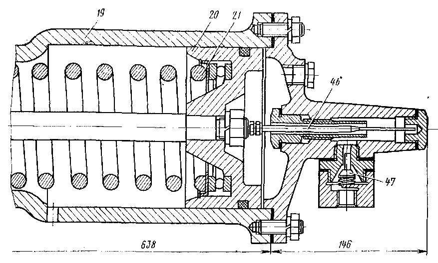 При впуске сжатого воздуха в цилиндр 19 и повышении давления в нем до 2,5 кгс/см2 сила, действующая на поршень, оказывается выше разности сил от пружин 21 и 3. В результате поршень 20