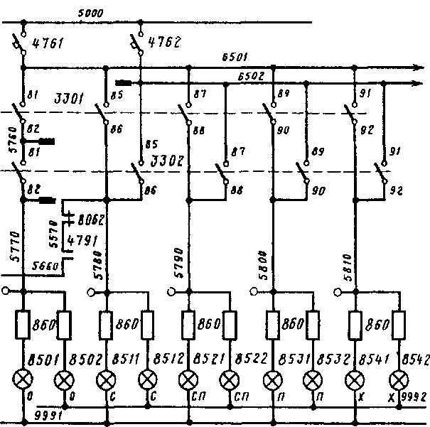 Цепь питания сигнальной лампы "0" (рис. 30); АЗВ 4761, провод 6501, блок-контакты 81 —82 ПБК 3301, провод 5760, блок-контакты 81 — 82 ПБК 3302, провод 5770, резистор 860, сигнальные лампы "0" 8501 и 8502, провод 999.