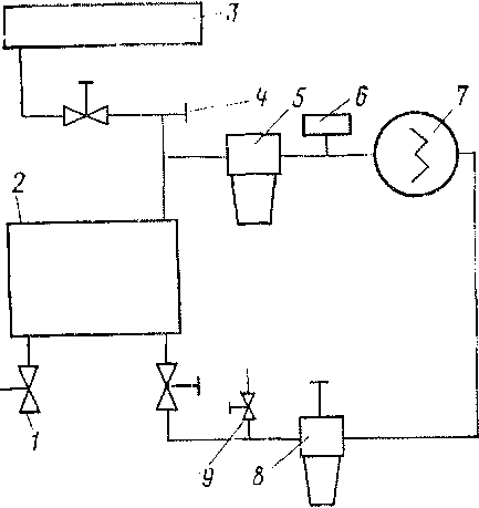 Рис. 117. Схема фильтрации масла: / — кран для слнва масла; 2 —бак избирателя; 3 —. расширитель; 4 — фланец для подключения стационарной установки фильтрации масла; В — фильтр тонкой очистки; б — реле давления; 7 — электродвигатель с насосом; ё — фильтр грубой очистки; 9 — кран для отбора проб масла