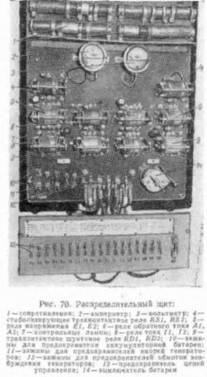 Распределительный щит (РЩ) предназначен для поддержания постоянного напряжения на зажимах генераторов управления, подключения батареи к генераторам, поддержания заданной величины зарядного тока и отключения батареи от генераторов с прекращением их работы, Для выполнения этих процессов на щите (рис, 70) установлены реле напряжения 5, стабилизирующее трехконтактное реле 4. шунтовое трехконтактное реле 9, реле тока 8, реле обратного тока 6, сопротивления /, предохранители, амперметр, вольтметр, контрольные лампы и выключатель. Реле объединены в два комплекта по числу генераторов управления и расположены симметрично иа правой и левой половине щита. Реле напряжения ЕІ (Е2) и реле тока // (12) воздействуют на напряжение генератора управления. 1 шунтируя или вводя сопротивления в цель обмотки возбуждения в зависимости от величины напряжения и тока.