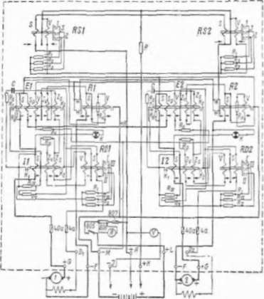 С увеличением нагрузки в стабилизирующей цепи (зажим — К) происходит падение напряжения вобмотке VptxeRS] и RS2. За счет магнитного потока обмотка S этих реле последние включаются и последовательно замыкают от одного до трех контактов, подключая параллельно сопротивлению R от одного до трех сопротивлений Rt, Rz. Общее сопротивление уменьшается н восстанавливается напряжение стабилизирующей цепи.