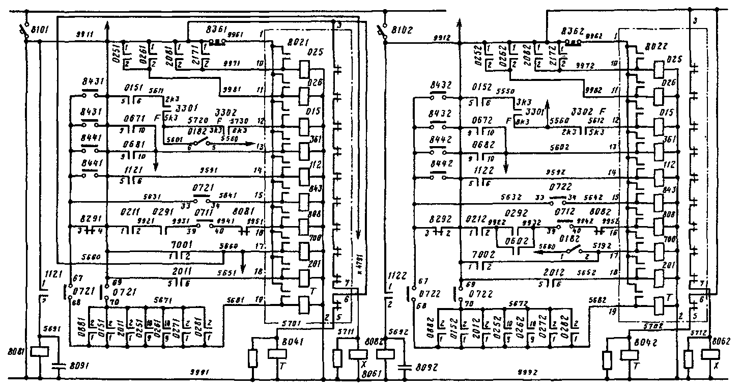 Сигнальное реле 8082 получает питание через прямые блок-контакты БВ 0212 и Л К 0292 или соединенные параллельно с ними прямые блок-контакты ЛК 0602, контакты переключателя "X — Т" 0712, обратные блок-контакты реле 8082.