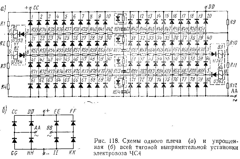 На электровозе ЧС4 имеются две конструктивно одинаковые выпрямительные установки типа RV10, каждая из которых включает в себя одну тяговую и одну вспомогательную выпрямительные установки. Тяговая выпрямительная установка представляет собой однофазный мост, в плечо которого входит 20 параллельных ветвей, состоящих из четырех последовательно соединенных кремниевых вентилей (рис. 118). Таким образом,' в одном плече находится 80, а во всей тяговой выпрямительной установке 320 вентилей. Применены вентили типа VK200/5, у которых номинальное амплитудное обратное напряжение составляет 500 В и номинальный (средний) прямой ток — 200 А.