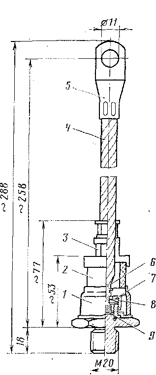 Вентиль УК200/5 (рис. 120) имеет корпус 1, изготовленный из меди. Ввод 3 вентиля изолирован от корпуса фарфоровым изолятором 2. Ввод в свою очередь соединен с гибким шунтом 4, к которому опрессов-кой крепится наконечник 5. Внутри корпуса ввод 5 спаян с медным внутренним вводом 6, опирающимся на пластинку с р-я-переходом 9. Пластинка находится на основании корпуса вентиля. Необходимое контактное нажатие создает стальная пружина 7, действующая через прокладку из слюды 8 на выступ внутреннего ввода. Верхний диск пружины упирается в кольцо вспомогательных деталей.