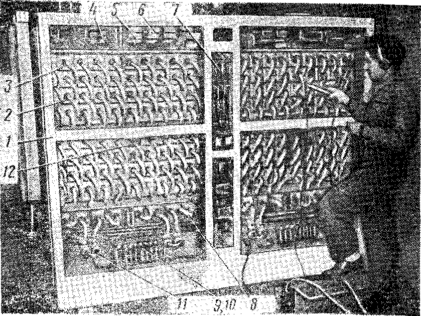 Корпуса радиаторов 3 в каждом горизонтальном ряду прикреплены один к другому за ушки болтами; при этом радиаторы электрически изолированы друг от друга текстолитовыми прокладками и втулками (под болты). К ушкам радиаторов болтами прикреплены проволочные резисторы связи. Комплект из пяти радиаторов установлен на вертикальных изолировочных текстолитовых плитах, которые смонтированы на каркасе шкафа 1. Охлаждающие ребра всех радиаторов размещены