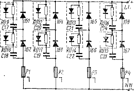 Нижнюю часть шкафа занимает выпрямительная установка 8 вспомогательных машин. В последнем горизонтальном ряду с каждой стороны шкафа размещено по два плеча однофазного моста, укомплектованных вентилями того же типа, что и тяговая выпрямительная установка. Плечо моста состоит из четырех параллельных ветвей, в каждой из которых включено последовательно по два вентиля (рис. 122). Параллельные ряды вентилей электрически не связаны между собой (нет ни жесткого соединения катодов вентилей, ни резисторов связи), так как для выпрямительной установки вспомогательных машин, имеющей большой запас по току, равномерное деление токов не обязательно.