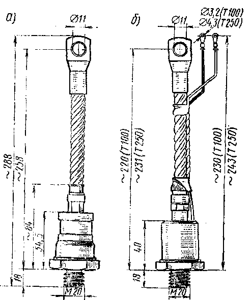 Рис. 123. Основные размеры и общий вид кремниевых вентилей, применяемых в полупроводниковых преобразовательных установках электровоза ЧС4Т: