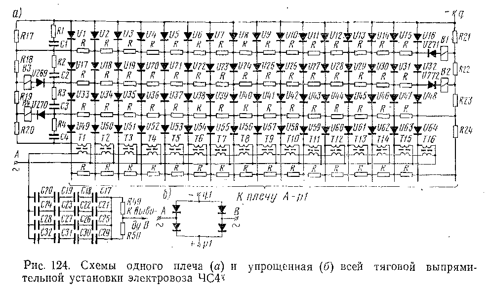Наличием компенсирующих трансформаторов и меньшим количеством вентилей в основном исчерпываются различия в схемах тяговых выпрямительных установок электровозов ЧС4 и ЧС4Т. Можно отметить также отсутствие германиевых диодов в контурах, обеспечивающих равномерное распределение обратного напряжения по вентилям и защиту их от коммутационных перенапряжений.