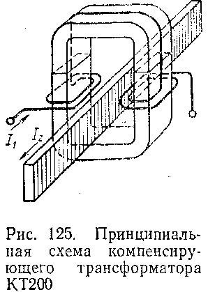 распределения падений напряжений на параллельно включенных вентилях, габаритные размеры использованных трансформаторов типа КТ200 невелики. Каждый трансформатор представляет собой замкнутый сердечник из магнитного материала АРчМСО МХ 6А с двумя обмотками (рис. 125). Первичная обмотка со.стоит из четырех витков медной шины сечением 30 X 2 мм, длиной около 850 мм. Вторичной обмоткой служит проходящая через окно сердечника медная шина сечением 4 X 10 мм. Обмотки вместе с сердечником залиты эпоксидной смолой (Ерохуё 110).