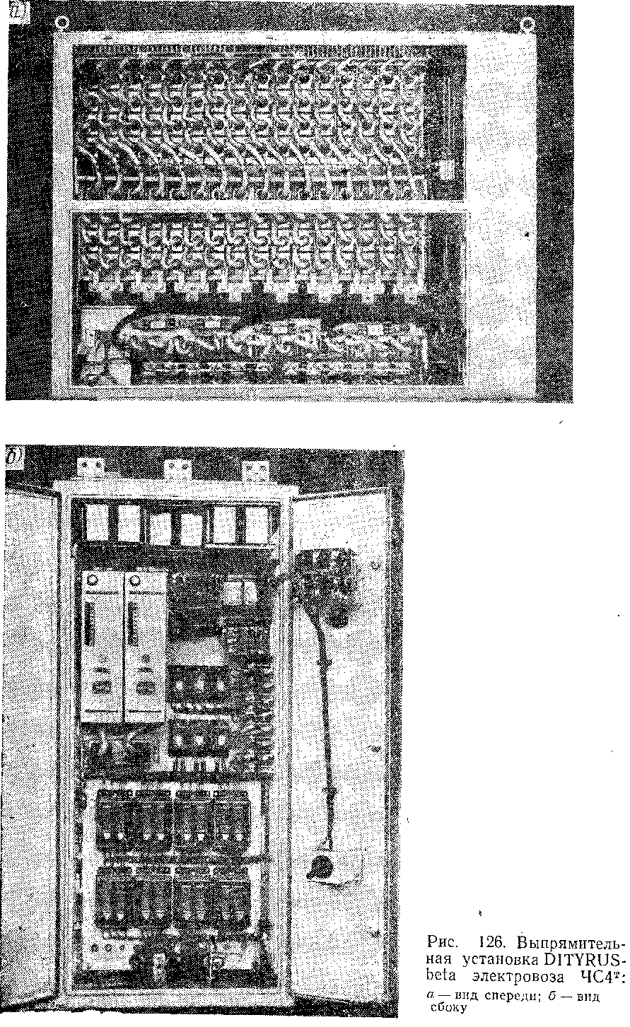 На электровозах ЧС4Т, как и на электровозах ЧС4 использованы две тяговые выпрямительные установки — по одной на три тяговых двигателя. В каждом плече выпрямительных мостов имеется 16 ветвей, состоящих из четырех последовательно включенных вентилей типа В 200 (рис. 123, а). Таким образом, всего в каждой выпрямительной установке типа ВІТУНиБ-Ьеіа использовано 256 вентилей.