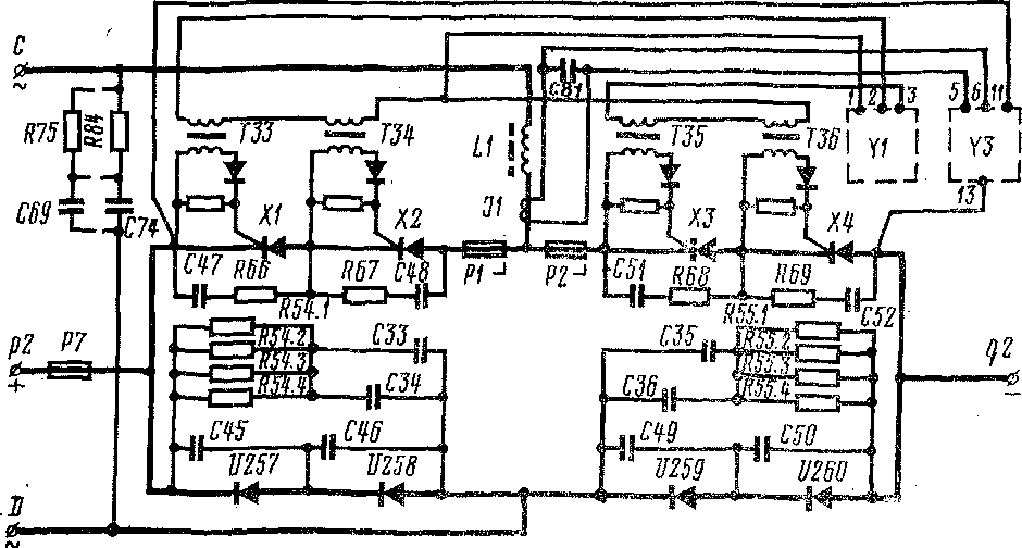 Выпрямительные установки вспомогательных машин электровозов ЧС4Т — их всего шесть: по три полууправляемых выпрямительных моста в каждом шкафу — совершенно одинаковы. Поэтому на рис. 127 приведена схема лишь одного моста 220v В его управляемых плечах включено последовательно по два тиристора XI — Х4 (Т100, 8-го класса), в неуправляемых по два кремниевых вентиля V257 — V 260 (D200, 9-го класса). Подвод переменного тока со стороны тиристоров производится через дроссель насыщения L1. Там же установлен датчик тока Л для системы управления тиристорами. Управляющие импульсы на тиристоры подаются через импульсные трансформаторы ТЗЗ — Т36 от системы управления, собранной из унифицированных электронных блоков Reckdyn-5 [Yl, Y3). Для защиты от токовых перегрузок и коротких замыканий использованы быстродействующие предохранители, причем установленные последовательно с тиристорами предохранители имеют контакты, связанные с цепями сигнализации электровоза. Защита от перенапряжений осуществляется контурами RC R75— R84 (10 Ом), С69 — С74 (8 мкФ) — от внешних и R53—R58, R66—R69 (33 Ом), С45 — С52 (2 мкФ) — от коммутационных.