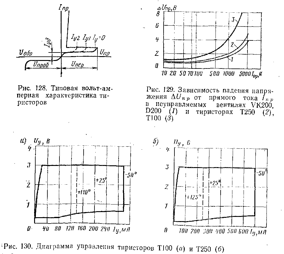 Величины тока и напряжения управления, при которых тиристор включается, зависят от целого ряда технологических и конструктивных факторов, и даже тиристоры одного типа имеют существенный разброс этих величин. Поэтому в паспорте на тиристоры указываются минимальные величины тока и напряжения в цепи управления, которые обеспечивают надежное включение тиристора во всех эксплуатационных режимах. Как следует из характеристики тиристора типа Т100 (рис. 130, а), для надежного,его включения, например, при температуре воздуха +25° С, управляющий импульс должен иметь ток, не менее 200 мА и напряжение не менее 3 В, а при температуре—50° С ток должен быть 300 мА или больше при том же напряжении 3 В.