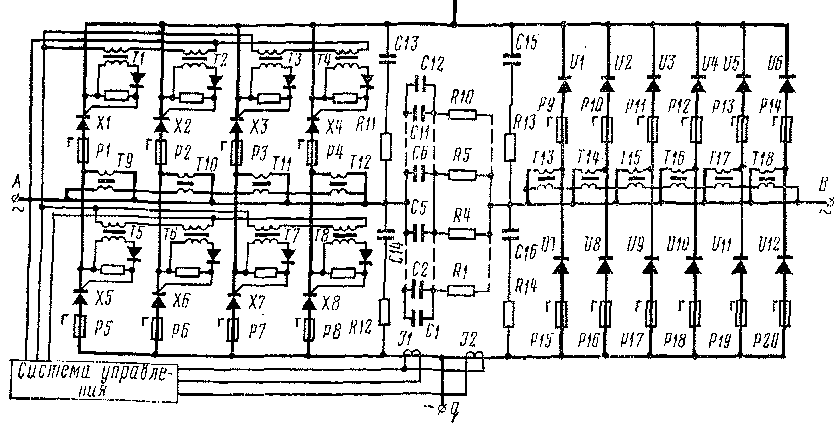 Как и в обычном выпрямительном мосту, на выводах переменного тока катоды последнего ряда вентилей одного плеча жестко связаны с анодами первого ряда вентилей соседнего плеча. Однако в выпрямительных установках типа ОІТУРчШ-Ьеіа переменный ток подводится к вентилям через