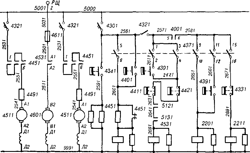 провод 2601, блок-контакты контактора 4451, катушка контактора 4451, провод 9991. После включения контактора 4451 в цепь его катушки вводится резистор.