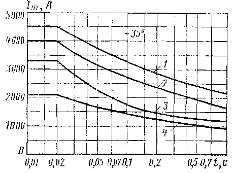 Ток, проходящий по вентилям в проводящем направлении, обусловливает основную часть потерь в вентилях. Вентиль рассчитан на номинальную мощность потерь, которой при определенных эксплуатационных услозиях соответствует номинальная температура р-п-пе-рехода. Из-за незначительной массы и небольшой теплоемкости кремниевого элемента вентили имеют очень малую термическую устойчивость. Увеличение допустимой мощности потерь, приводящее к превышению предельного значения температуры (для разных типов вентилей они различны), вызывает разрушение /?-?г-перехода. В связи с этим допустимое время протекания тока через вентили при коротком замыкании или перегрузке должно быть ограничено. При эксплуатации полупроводниковых преобразовательных установок их защита должна обеспечить, чтобы указанные на рис. 133 предельные значения не превышались.