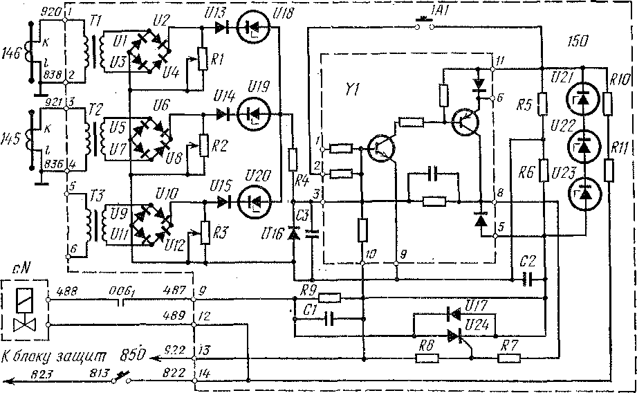 датчиками перегрузки или короткого замыкания в выпрямительной установке. На электровозах до ЧС4-061 включительно установлены четыре трансформатора 145—148. Вторичные обмотки трансформаторов k — / подключены к входным зажимам 1-2 и 3-4 блока управления электропневматическим вентилем; зажимы 5-6 являются резервными. Ток, проходящий по вторичным обмоткам трансформаторов тока, понижается трансформаторами Tl, Т2 в блоке управления (блок 150). Затем напряжение подается на вход выпрямительных мостов Ul — U4 и U5 — U8. Выпрямленный ток проходит по регулируемым резисторам R1 и R2, с помощью которых задается уставка срабатывания. Напряжение с этих резисторов через разделительные диоды U13, U14, стабилитроны U18, U19, резистор R4 и защитный диод U16 подводится на входные зажимы 3 и 9 триггера Y1, который усиливает сигнал и через ограничительный резистор R7 подает его на управляющий электрод тиристора U24.