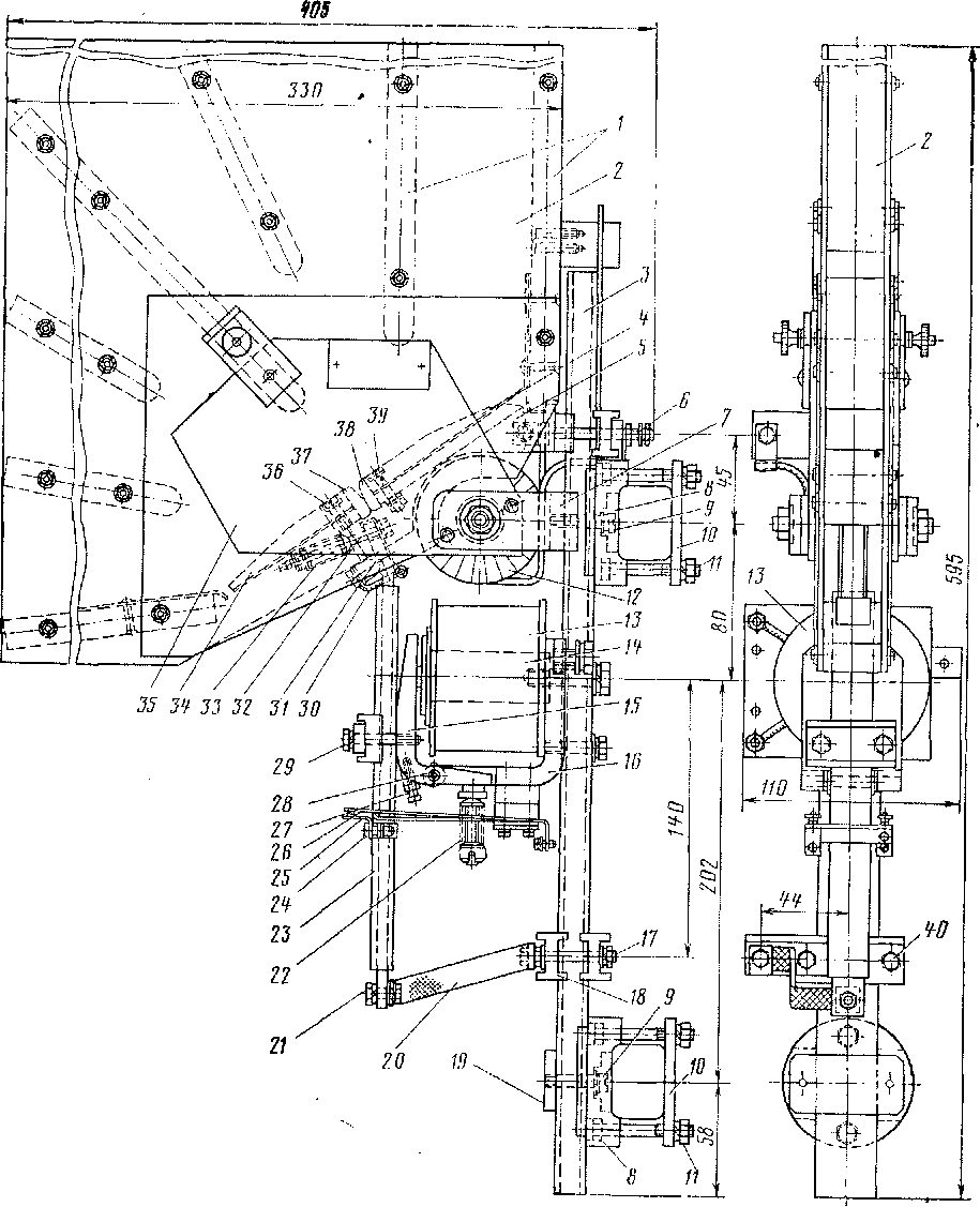 Дугогасительная система опирается на латунный держатель 7, отлитый под давлением. Ниже в стойке прикреплены ярмо 16 и сердечник 14 включающей (подъемной) катушки 13. Катушка намотана эмалированным проводом диаметром 0,35 мм и имеет 6750 витков. Якорь 15 соединен с ярмом валиком 28, который является осью всей подвижной системы аппарата.
