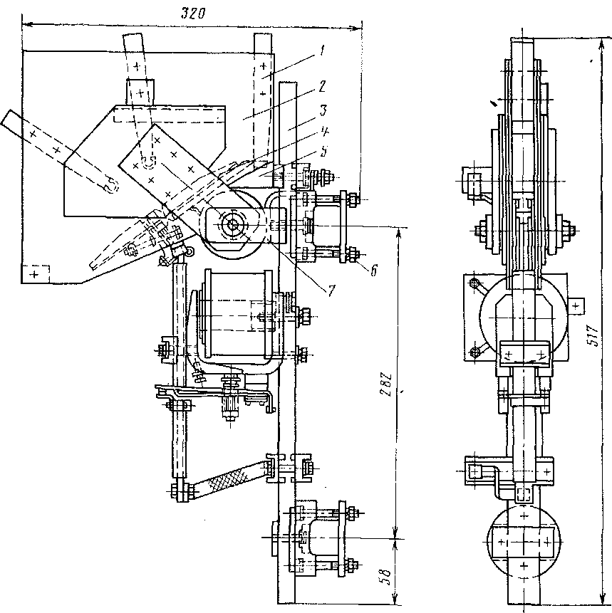 К якорю болтами 29 прикреплен токопроводящий стержень 23, имеющий изоляцию, рассчитанную на максимальное напряжение контактной сети. В верхней части стержня имеется болт 32, пропущенный через держатель 31 подвижного контакта 37. Между держателем 31 и гайкой болта помещена притирающая пружина 33, которая стремится повернуть держатель к стержню 23. Держатель имеет выступ, входящий во впадину стержня.