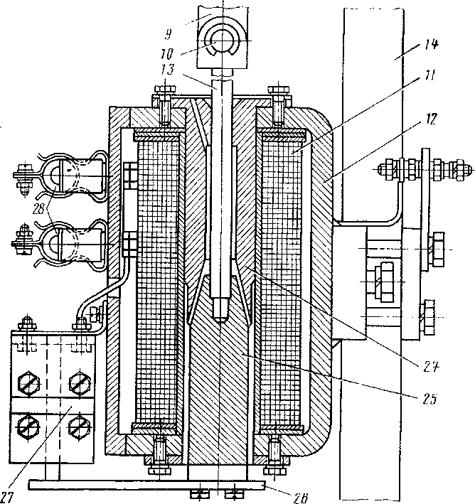 К ярму 12 прикреплены два трубчатых резистора 28 и коробка с блок-контактами 27. Подвижные контакты планок 26 соединены с якорем 25 и передвигаются вместе с последним.