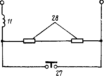 Резисторы 28 включаются последовательно катушке 11 после замыкания контактора и размыкания блок-контакта 27 (рис. 150). Это уменьшает ток катушки, но контактор не отключается, так как после приближения якоря 25 к сердечнику 24 (см. рис. 149) для создания необходимого магнитного потока и силы нажатия контактов требуется меньший ток. Сделано это для уменьшения нагревания катушки и снижения расхода электроэнергии.