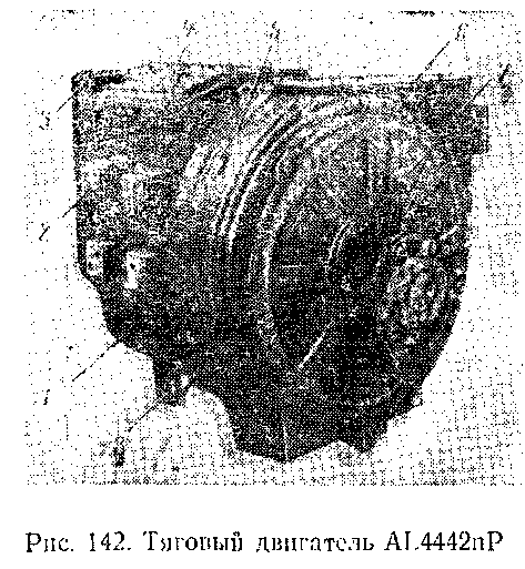 Тяговый двигатель типа АЬ4442пР (рис. 142) состоит из остова, якоря, шести главных полюсов, шести дополнительных полюсов, траверсы, шести щеткодержателей, двух подшипниковых щитов с подшипниками и карданного привода.