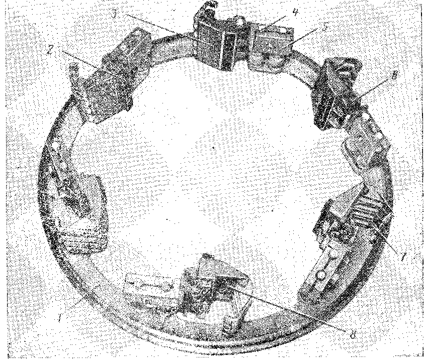 цом. К рифленому торцу болтом крепится корпус 3 щеткодержателя. Он отлит из латуни и имеет четыре калиброванных гнезда для установки щеток 2. Новые щетки имеют высоту 50 мм, ширину 32 мм и толщину 25 мм. Чтобы увеличить сопротивление для токов в короткозамкнутой секции от несбалансированной э. д. с, применены разрезные сдвоенные щетки. Каждая щетка имеет армировку и гибкий медный шунт 6 с наконечником. Ток проходит через щетки и гибкие медные шунты, минуя нажимные пальцы и регулировочные пружины. В эксплуатации хорошо зарекомендовали себя щетки марки ИЕ59М. Щеткодержатель снабжен четырьмя нажимными пальцами 7 с наконечниками из изоляционного материала. Нажимные пальцы имеют регулировочные пружины 8. Нажатие пальца на щетку н, следовательно, нажатие щеток на коллектор 2,5—3 кгс. От рабочей поверхности коллектора 3 (см. рис. 144) щеткодержатели устанавливают на расстоянии 2,5 мм. Щеткодержатели одинаковой полярности соединены между собой шинами, укрепленными в клицах.