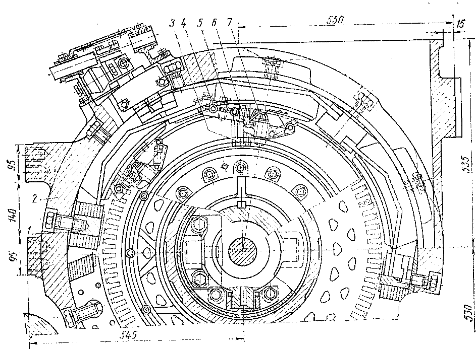 Для уменьшения потерь сердечник 6 якоря набран из штампован-ных листов электротехнической стали. В листах сделаны треугольные отверстия с закругленным» углами, которые после, сборки сердечника образуют вентиляционные каналы. Наружный диаметр сердечника якоря 710 мм, внутренний 400 мм, длина 350 мм. Сердечник имеет по внешней поверхности 87 пазов высотой 34,3 мм и шириной 10,55 мм. В полости втулки якоря помещен поршень 8 внутренней шарнирной муфты и карданный вал 4. Полость закрыта крышкой, уплотненной резиной, В полость для смазывания внутреннего шарнира наливают приблизительно 3,5 л масла, способного работать при низких температурах.