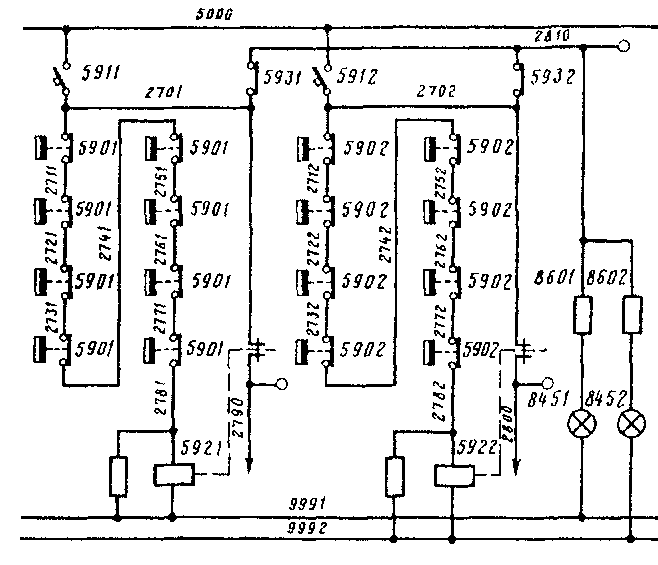 1 (4), провод 274. контакты плавких вставок предохранителей 590 тележки 2 (3), провод 278. катушка реле 592, провод 999.