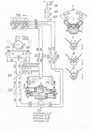 На нулевом положении контроллера от пальца /. подается питание на палец М к проводом 402 (462) через сопротивление 3071 (3072) провод 418, блокконтакты А-В привода главного контроллера 045, провод 407, палыш реверсивного барабана АікВі, провод 404(464), палец В ведущего барабана, контакты переключателя ВС, палец С. провод 405 (465) и на катушку защелки 3051 (3052).