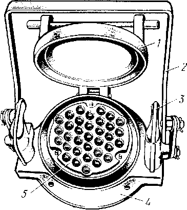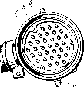 в котором находится изоляционная панель 5 с контактными гнездами. Сзади панели в гнезда ввернуты контактные зажимы, в которые впаяны провода цепей управления. В алюминиевом корпусе 8 с крышкой 7 штепселя укреплена изоляционная панель 9 с 34 контактными вилками из бронзы, в которые ввернуты контактные зажимы. При соединении штепсель своими боковыми приливами 6 входит в ползуны 3 розетки. Рычаг 2 находится в верхнем положении. При повороте рычага вниз ползуны направляют штепсель в розетку и в положении, при котором все штыри вставлены в гнезда, рычажный механизм запирает штепсель. Розетка при вынутом штепселе закрывается крышкой /. Для предохранения от повреждений и загрязнения штепсель при расчлененном соединении вставляется в холостой приемник, который имеет такую же конструкцию, как и розетка, но не имеет панели с электрическими контактами. Технические данные соединения:
