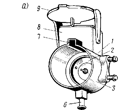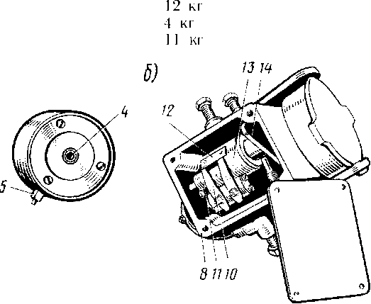 Конструкция розеток 1РШ.006, 1РШ.006.1 и вилок 1ВШ.006, 1ВШ.006.1 отличается от соединения с розеткой РСБ-20-16Б,В и штепселем ШС-20-16Б,В, которые установлены на электропоездах первых выпусков, только уплотнитель-ными уплотнениями розетки и штепселя, обеспечивающими пылебрызговлагоне-проницаемость, а также наличием запорного замка. Замок удерживает вилку, включенную в розетку, а при выключенной вилке — крышку розетки. Розетка РСБ-20-16 представляет-собой литой корпус / (рис. 190, а), в цилиндрической части которого укреплена круглая карболитовая панель 2 с контактным бронзовым штырем 3. В верхней части розетки в закрытой коробке 8 размещена электрическая блокировка барабанно-поворотного типа. Напряжение на штырь 3 может быть подано только при замыкании этой блокировки. Барабан 13 (рис. 190,б) под действием пружины // стремится повернуться по часовой стрелке (если смотреть справа), при этом пальцы 10 сходят с медного сегмента 12 барабана. Розетка без штепселя закрывается крышкой 9. Штепсель ШС-20-16 представляет собой отрезок трубы, внутри которой размещена круглая карболитовая панель с контактным латунным гнездом 4; на цилиндрической части штепселя имеется прилив 5, который при соединении штепселя с розеткой входит в паз 7 цилиндрической части розетки и в вилку 14, поворачивая и замыкая ее блокировку. Паз 7 на цилиндрической части розетки сделан фигурным, поэтому, чтобы вытащить штепсель, его необходимо сначала повернуть в пазу. Одновременно при помощи специального водила поворачивается и барабан блокировки, размыкая блок-контакты, включенные в цепь управления контактора отопления. Таким образом, размыкание силовых контактов происходит при обесточенной цепи, а при вынутом штепселе не может быть подано напряжение на контакты розетки. Вставленный и повернутый штепсель удерживается защелкой 6 и планкой крышки розетки.