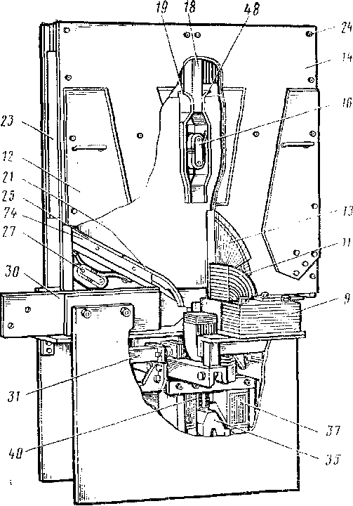 При движении дуги вверх она охлаждается боковыми стенками, а также дополнительными вертикальными перегородками 39, расчленяющими ее на параллельные дуги, что также способствует ее лучшему охлаждению. Перегородки скреплены прокладками 20. Бруски 74, на которые помещены рога, изготовлены из микоплакса (спрессованный порошок слюды со связующим). Дугогасительная камера помещается между башмаками 13 так, что они соприкасаются со стенками 14 этой камеры. Дополнительным креплением камеры служат пружинящие пластины 38.