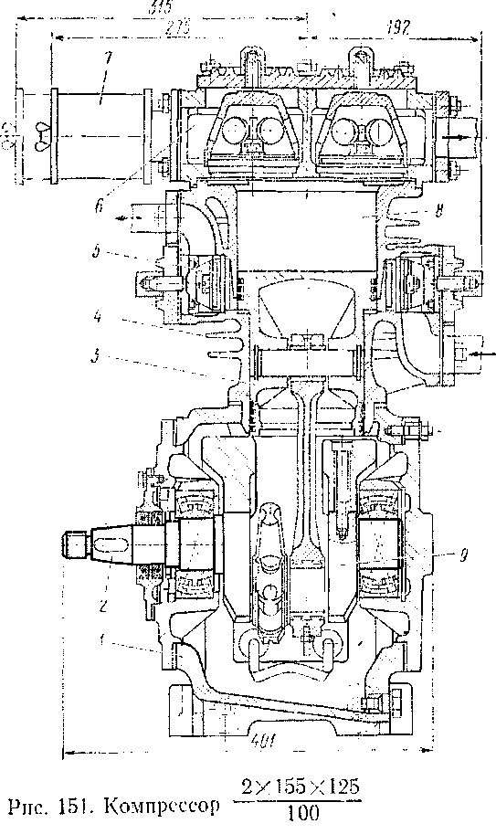 Воздух в цилиндрах сжимают поршни (рис. 152), имеющие возвратно-поступательное движение. Поршни 4 выполнены из легкого металла и снабжены тремя уплотняющими кольцами 3 диаметром 155 мм, тремя уплотняющими кольцами 7 диаметром 125 мм и одним маслосъемным кольцом 8. Поршни имеют привод от коленчатого вала через кривошип-но-шатунный механизм. В головке стального шатуна / запрессована бронзовая втулка 2, в которой помещена поршневая цапфа 6, зафиксированная двумя предохранительными кольцами 5. Разъемные подшипники 9 (см. рис. 151) шатунов обоих цилиндров уложены рядом на коленчатом валу 2. Подшипники залиты подшипниковым сплавом.