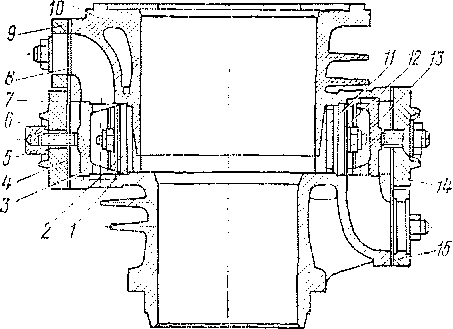 сильно повышается, затрудняя нормальную смазку цилиндров и увеличивая расход энергии на работу компрессора. Чтобы предотвратить чрезмерное повышение температуры, процесс сжатия воздуха разделен на две ступени. В цилиндрах низкого*давления происходит первая ступень сжатия; в цилиндрах высокого давления — вторая ступень сжатия уже охлажденного в трубопроводах воздуха. Процесс сжатия во второй ступени происходит в момент всасывания воздуха в полость б5 цилиндра первой ступени при ходе поршня в сторону от головок цилиндров. Диаметр цилиндров первой ступени сжатия 155 мм, второй ступени — 125 мм. В головках цилиндров (рис. 153) расположены всасывающие 16 и нагнетательные 15 клапаны первой ступени сжатия с уплотнениями 17 и 14. Клапаны фиксируют колпачками 3 и 6, которые прижимают болтами 4 с закрытыми гайками 5 и уплотнениями 2. Головки цилиндров закрыты крышками / с уплотнениями 7. К корпусу 8 головок болтами 9 с гайками 10 и шайбами // крепят фланцы 12 с уплотнениями 13.