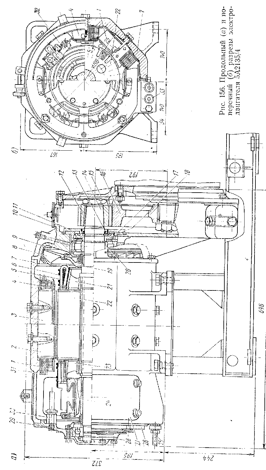 Коленчатый вал компрессора через зубчатую передачу соединен с валом электродвигателя (рис. 156) типа 5А2135/4. Остов 7 электродвигателя отлит из электротехнической стали и имеет форму восьмигранной призмы, которая у коллектора переходит в цилиндр. В нижней части остова предусмотрены четыре опорные лапы 34 с отверстиями для болтов, крепящих электродвигатель к фундаментной плите. Вверху остова имеются скобы для транспортировки электродвигателя. Для осмотра коллектора и щеточного аппарата со стороны коллектора в остове предусмотрены два прямоугольных люка, закрытые листовыми крышками 27.