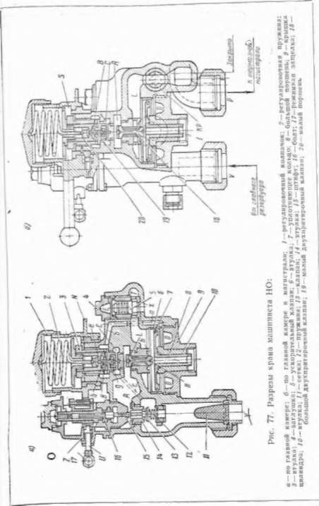 Описанный процесс соответствует ступени торможения. Каждая тормозная градация ручки крана понижает давление в магистрали на 0,2 от. При ступенчатом и полном служебном торможении ускорительный клапан 5 не срабатывает, так как происходит одновременная медленная разрядка камеры Е над клапаном 5 и камеры Т под тем же клапаном. Кроме того клапан 5 имеет большую площадь со стороны камеры £ и малую площадь снизу, что также препятствует подъему клапана при служебном торможении. В положении экстренного торможения совершенно ликвидируется давление пружины 2 на малый поршень 20, так как колпачок / будет полностью вывернут, вследствие чего поршень переместится вверх на полную величину езоего хода. Это дает возможность полностью открыться атмосферному отверстию в малом поршне. Камеры й, £ и О полностью освобождаются от давления,а давлением из магистрали поднимается вверх клапан 5, сообщая с атмосферой широким каналом х магистральную камеру Е. Кроме того, срабатывает и поршень 8, как при служебном торможении.