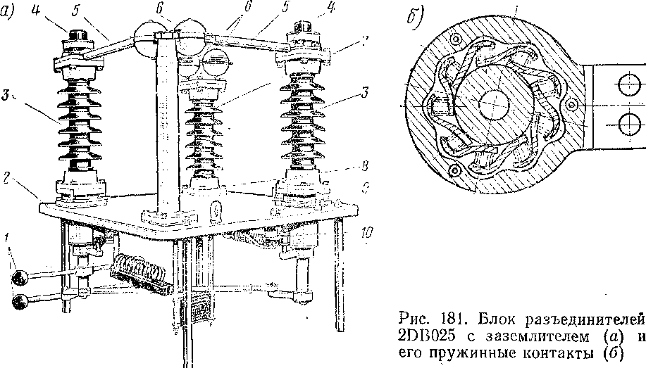 Принципиально разъединители представляют собой однополюсные переключатели рубящего типа с ручным приводом. Блок разъединителей 20В025 с заземлителем (рис. 181, а) смонтирован на четырехугольной опорной металлической плите 2, установленной в люке на крыше электровоза. Плиту к крыше крепят шпильками М16. Для уплотнения плиты применяют резиновую прокладку.- Сверху на плите имеются три фарфоровых изолятора: на двух изоляторах — поворотных 3 находятся подвижные ножевые контакты 5, на третьем— неподвижном изоляторе 7 установлены две контактные головки 6 с медными контактами. Такая же пара контактных головок укреплена на металлической заземляющей консоли 8. Под плитой расположен пружинный привод разъединителей. Для удобства включения и отключения разъединителей обе управляющие рукоятки 1 находятся на одной оси. Верхняя рукоятка связана с левым, нижняя — с правым поворотным изолятором. Фиксацию включенного и отключенного положения разъединителей обеспечивают пружины 10. Снизу к опорной плите крепят блок-контакты, включенные в цепь электропневматических вентилей токоприемников. Силовое электрическое соединение подвижных ножевых контактов разъединителей с неподвижными головками 4 осуществляется через Б-образные пружинные контакты (рис. 181, б). Неподвижные головки 4, а также контактные головки разъединителей связаны с силовой цепью электровоза гиб-