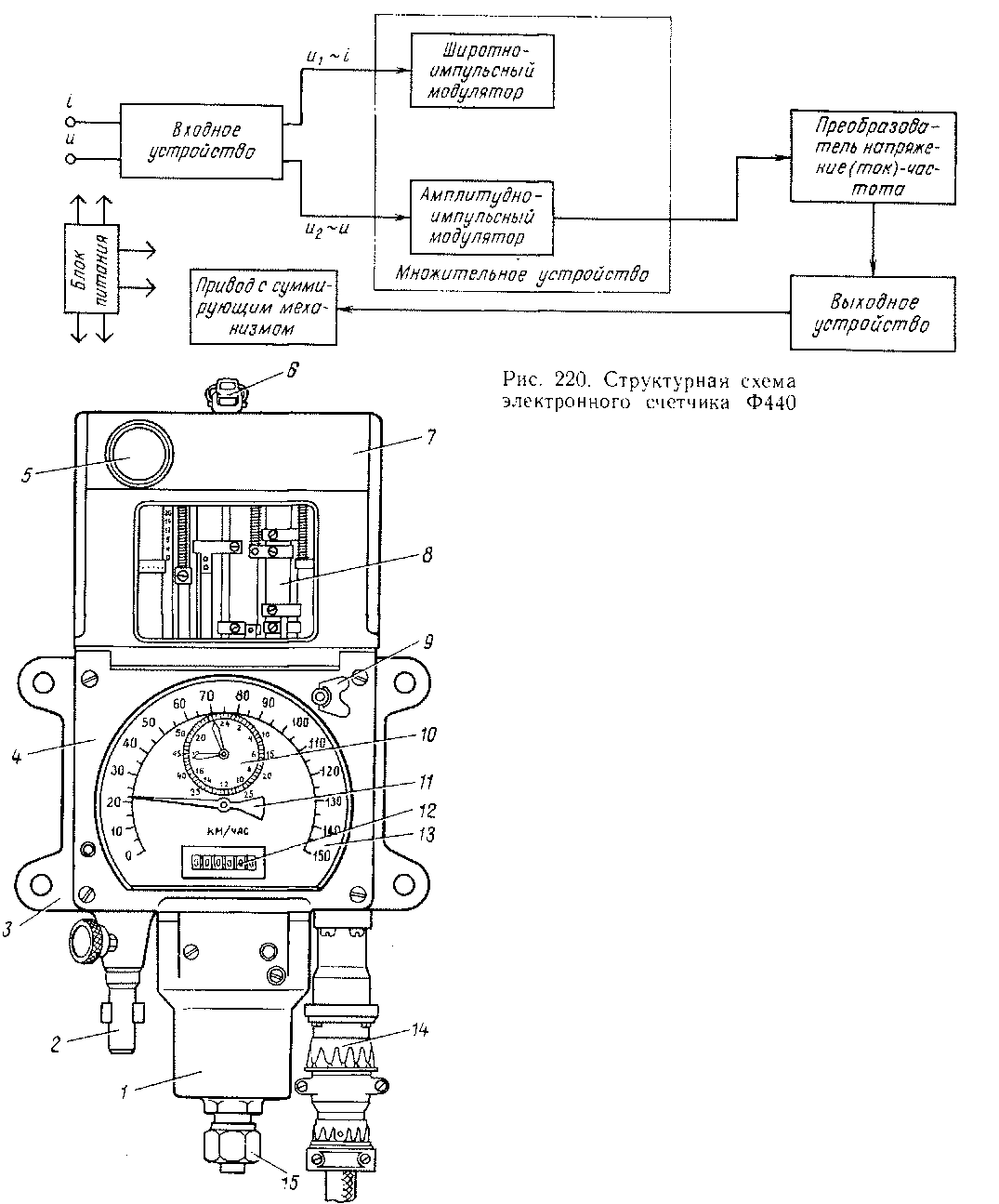 Устройство и принцип работы. Структурная схема счетчика приведена на рис. 220. Основой построения счетчика является преобразование измеряемой энергии во время-импульсный код с последующим интегрированием и запоминанием числа импульсов. Число импульсов соответствует измеряемой активной электроэнергии.