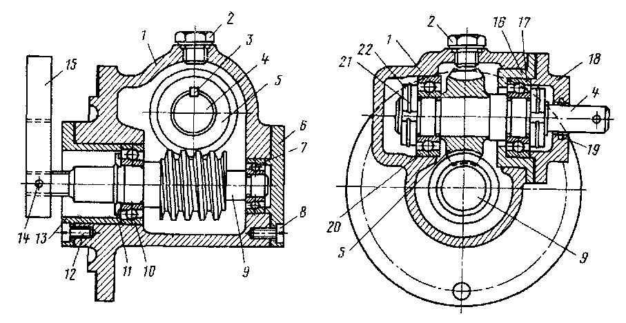 Корпус / редуктора прикреплен тремя болтами к крышке буксы. В корпусе на шариковых подшипниках 10 (тип 5Кр7205) и / (типа ЭКР7202) укреплен червяк 9, соединенный штифтом 14 с по водком 15, а последний —- с осью колесной пары. При движение электровоза червяк вращается, одновременно поворачивается сцепленное с ним червячное колесо 5, фиксируемое на валу 4 шпонкой 3. Цапфы вала опираются на корпус 1 через шариковые подшипники 17 и 20 (тип 5КР6205). Последние удерживаются на валу предохранительными кольцами 21 и гайками 22.