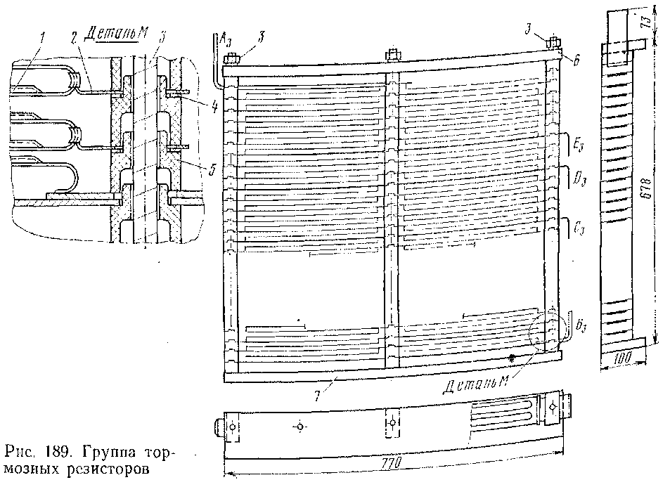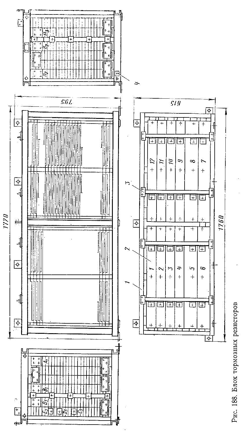 Блок тормозных резисторов (рис. 188) состоит из каркаса 1, в котором установлены двумя столбиками двенадцать секций резисторов 2. Каждая секция состоит из нескольких витков непрерывной фехрале-вой ленты сечением 1,2 X 60 или 1 X 60 мм. Для получения необходимой жесткости лента прессуется;, что придает ей фасонную форму, которая способствует также лучшему охлаждению ленты. К каркасу 1 прикреплены четыре крепления 3 и заземляющий зажим 4.